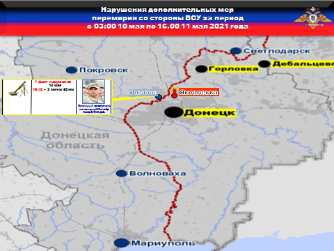 Факты нарушений в оперативном порядке доведены до представителей украинской стороны в СЦКК, с целью своевременного принятия мер к нарушителям перемирия и исключения случаев фальсификации учетных данных о нарушениях режима прекращения огня со стороны украинских боевиков. СММ ОБСЕ в своих отчётах также подтверждает агрессию вооруженных формирований Украины. В частности в отчете СММ ОБСЕ от 10 мая сообщается о повреждениях сразу нескольких объектов гражданской инфраструктуры Донецкой Народной Республики, ставших результатом применения боевиками 15 батальона 58-й бригады 122-мм артиллерии. Так, 5 мая артиллерийским обстрелом украинских боевиков повреждены объекты на территории Водонасосной станции в Киевском районе, а 4 мая в результате обстрела с позиций 1-го батальона 28 бригады повреждено здание действующей школы № 116 г.Донецка.