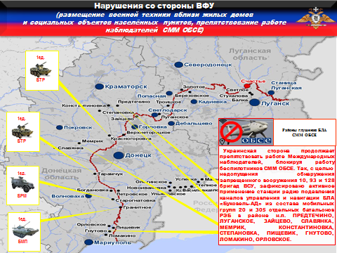 Украинская сторона продолжает препятствовать работе международных наблюдателей, блокируя работу беспилотников СММ ОБСЕ. Так, с целью недопущения обнаружения запрещенного вооружения 10, 93 и 128 бригад ВСУ зафиксировано активное применение станций радиоподавления каналов управления и навигации БПЛА «Буковель-АД» из состава мобильных групп 20 и 305 отдельных батальонов РЭБ в районе н.п. ПРЕДТЕЧИНО, ТРОИЦКОЕ, ЛУГАНСКОЕ, ЗАЙЦЕВО, СЛАВЯНКА, МЕМРИК, КОНСТАНТИНОВКА, СТЕПАНОВКА, ПИЩЕВИК, ГНУТОВО, ЛОМАКИНО, ОРЛОВСКОЕ.