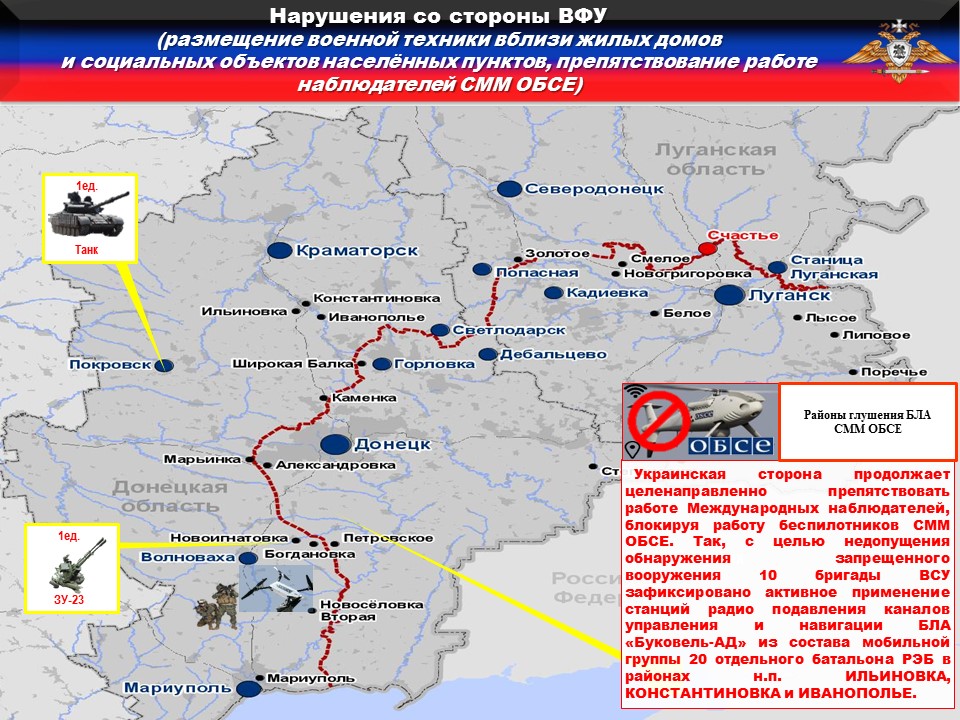 Украинская сторона продолжает целенаправленно препятствовать работе Международных наблюдателей, блокируя работу беспилотников СММ ОБСЕ. Так, с целью недопущения обнаружения запрещенного вооружения 10 бригады ВСУ зафиксировано активное применение станций радио подавления каналов управления и навигации БЛА «Буковель-АД» из состава мобильной группы 20 отдельного батальона РЭБ в районах н.п. ИЛЬИНОВКА, КОНСТАНТИНОВКА и ИВАНОПОЛЬЕ.