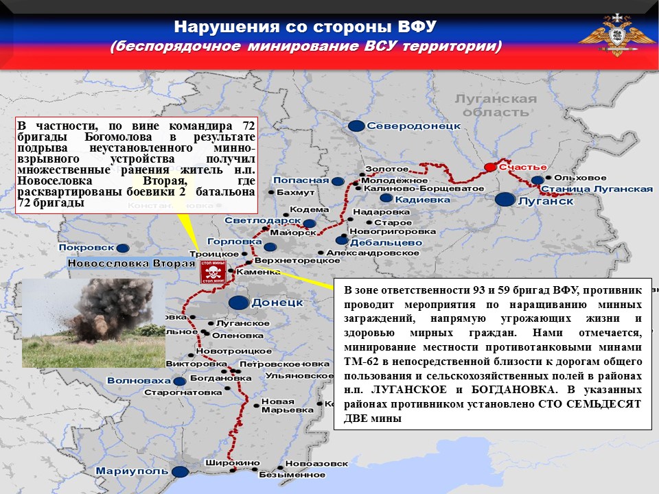 В зоне ответственности 93 и 59 бригад ВФУ, противник проводит мероприятия по наращиванию минных заграждений, напрямую угрожающих жизни и здоровью мирных граждан. Нами отмечается, минирование местности противотанковыми минами TM-62 в непосредственной близости к дорогам общего пользования и сельскохозяйственных полей в районах н.п. ЛУГАНСКОЕ и БОГДАНОВКА. В указанных районах противником установлено СТО СЕМЬДЕСЯТ ДВЕ мины.