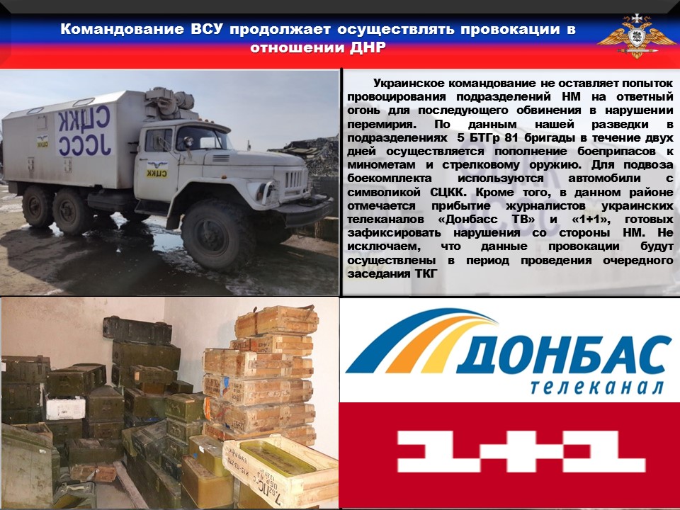 По данным нашей разведки в подразделениях 5 БТГр 81 бригады в течение двух дней осуществляется пополнение боеприпасов к минометам и стрелковому оружию. Для подвоза боекомплекта используются автомобили с символикой СЦКК. Кроме того, в данном районе отмечается прибытие журналистов украинских телеканалов «Донбасс ТВ» и «1+1», готовых зафиксировать нарушения со стороны НМ. Не исключаем, что данные провокации будут осуществлены в период проведения очередного заседания ТКГ.