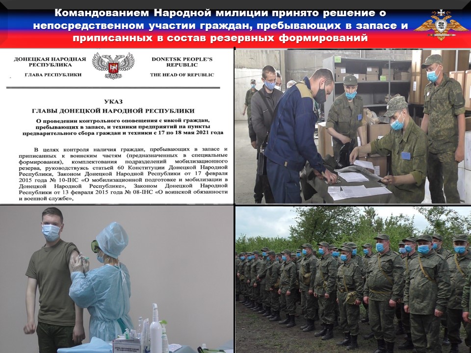 В соответствии с решением Главы Донецкой Народной Республики, в рамках проводимых в Республике совместных мероприятий органов управления и сил функциональных и территориальных подсистем Единой государственной системы предупреждения и ликвидации чрезвычайных ситуаций, командованием Народной милиции принято решение о непосредственном участии граждан, пребывающих в запасе и приписанных в состав резервных формирований для выполнения мероприятий по ликвидации последствий ЧС.