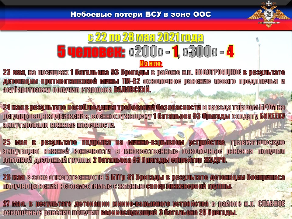 В период с 22 по 28 мая в соединениях и частях ОТГ «Восток» небоевые потери составили ПЯТЬ военнослужащих, ОДНА из которых безвозвратная: