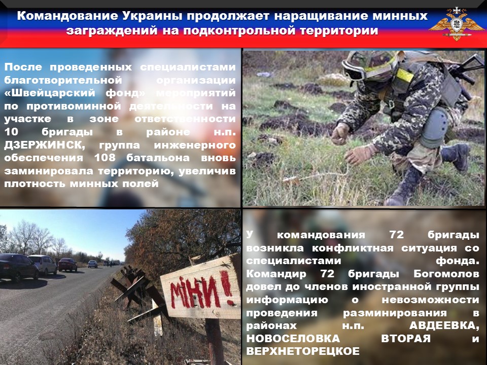 Согласно договорённостям гендиректора данной благотворительной организации Хансъорга Эберли с военно-политическим руководством Украины, гуманитарному разминированию подлежит вся территория вдоль линии соприкосновения, однако, командир 72 бригады Богомолов довел до членов иностранной группы информацию о невозможности проведения разминирования в районах н.п. АВДЕЕВКА, НОВОСЕЛОВКА ВТОРАЯ и ВЕРХНЕТОРЕЦКОЕ, сославшись на отсутствие условий безопасности.