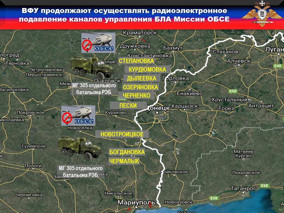 Миссия ОБСЕ неоднократно сообщала о препятствовании Украиной выполнению своего мандата на подконтрольной территории ВСУ. В связи с участившимися случаями блокирования сигналов управления и навигации БЛА Миссии станциями РЭБ ВСУ, на текущей неделе прибыла комиссия ОБСЕ во главе с Генеральным секретарем Х.Шмид. По полученной информации представители международной организации потребовали от украинской стороны возместить материальный ущерб, возникший вследствие ПЯТИ случаев аварийных посадок и крушений БЛА СММ ОБСЕ дальнего радиуса действия в районе н.п. СТЕПАНОВКА во время работы станции радиоподавления БЛА «Буковель-АД» мобильной группы 305 батальона РЭБ.