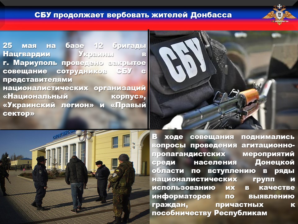 25 мая на базе 12 бригады Нацгвардии Украины в г. Мариуполь проведено закрытое совещание сотрудников СБУ с представителями националистических организаций «Национальный корпус», «Украинский легион» и «Правый сектор».