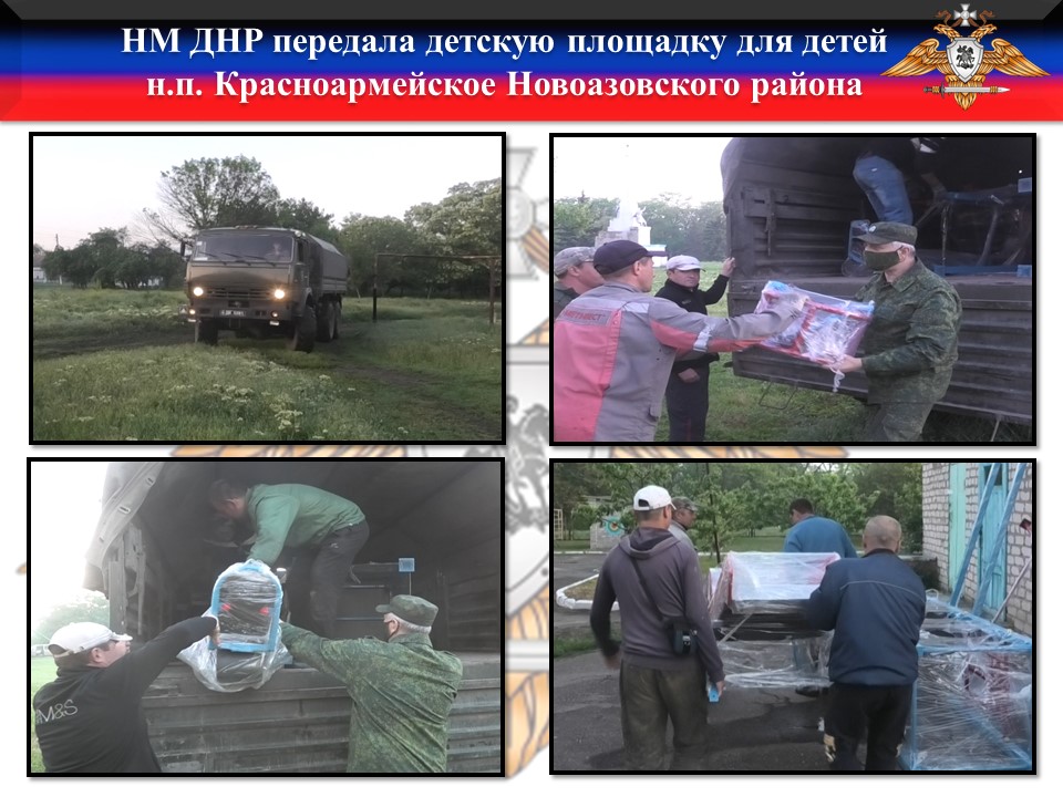 Народная Милиция ДНР совместно с волонтерами и гуманитарными организациями продолжает оказывать гуманитарную помощь жителям прифронтовых районов по всей территории республики. Так, для детей из населенного пункта Красноармейское в Новоазовском районе, который неоднократно подвергался обстрелам со стороны ВСУ, была доставлена детская площадка.