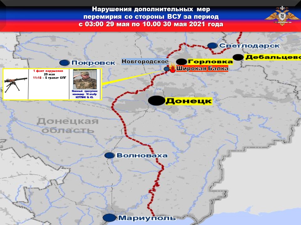 Факт нарушения в оперативном порядке доведен до представителей украинской стороны в СЦКК, с целью своевременного принятия мер к нарушителям перемирия и исключения случаев фальсификации учетных данных о нарушениях режима прекращения огня со стороны украинских боевиков.