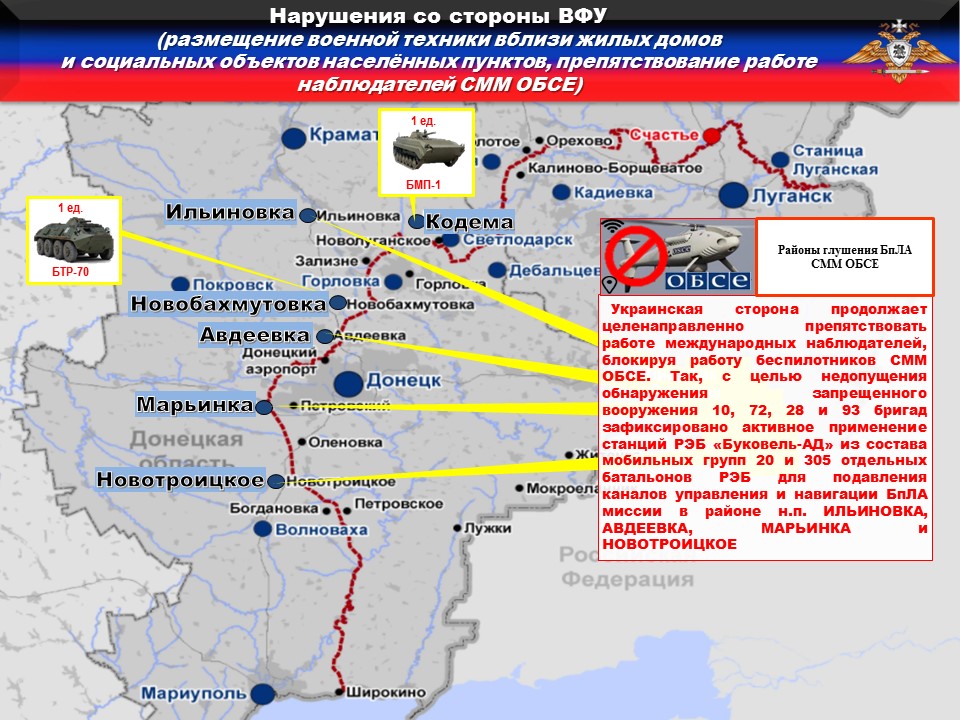 Украинская сторона продолжает целенаправленно препятствовать работе международных наблюдателей, блокируя работу беспилотников СММ ОБСЕ. Так, с целью недопущения обнаружения запрещенного вооружения 10, 72, 28 и 93 бригад зафиксировано активное применение станций РЭБ «Буковель-АД» из состава мобильных групп 20 и 305 отдельных батальонов РЭБ для подавления каналов управления и навигации БпЛА миссии в районе н.п. ИЛЬИНОВКА, АВДЕЕВКА, МАРЬИНКА и НОВОТРОИЦКОЕ.