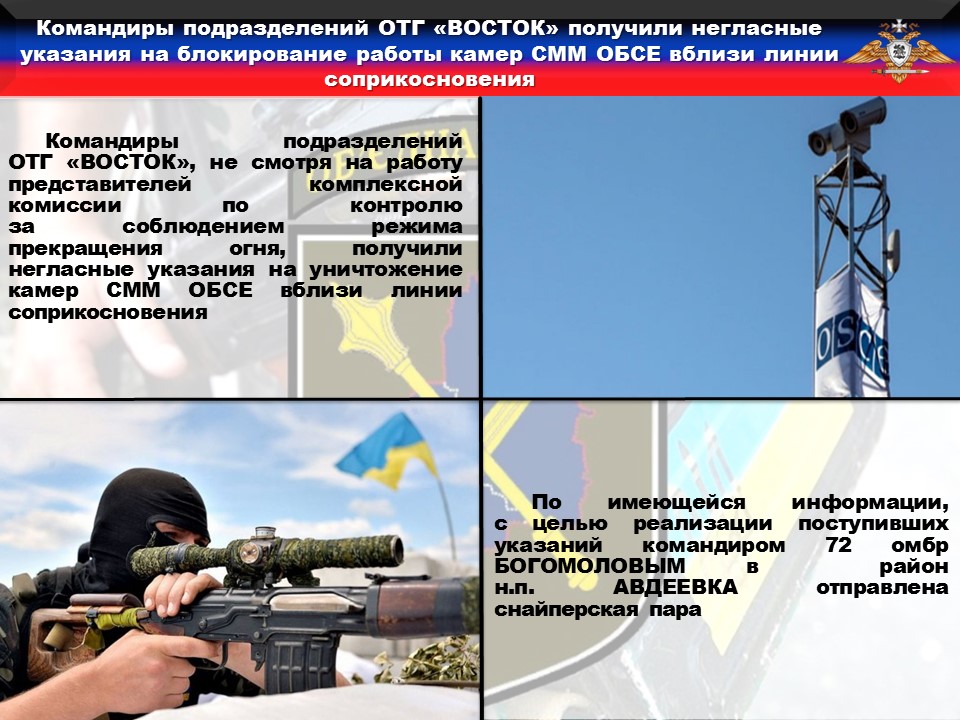 Командиры подразделений ОТГ «ВОСТОК», не смотря на работу представителей комплексной комиссии по контролю за соблюдением режима прекращения огня, получили негласные указания на уничтожение камер СММ ОБСЕ вблизи линии соприкосновения.