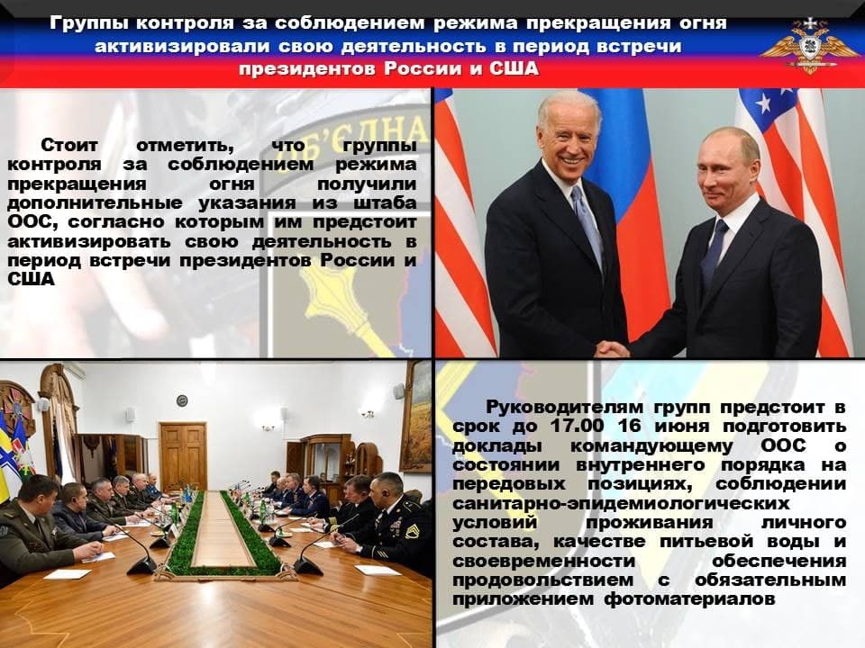Стоит отметить, что группы контроля за соблюдением режима прекращения огня получили дополнительные указания из штаба ООС, согласно которым им предстоит активизировать свою деятельность в период встречи президентов России и США. Руководителям групп предстоит в срок до 17.00 16 июня подготовить доклады командующему ООС о состоянии внутреннего порядка на передовых позициях, соблюдении санитарно-эпидемиологических условий проживания личного состава, качестве питьевой воды и своевременности обеспечения продовольствием с обязательным приложением фотоматериалов.