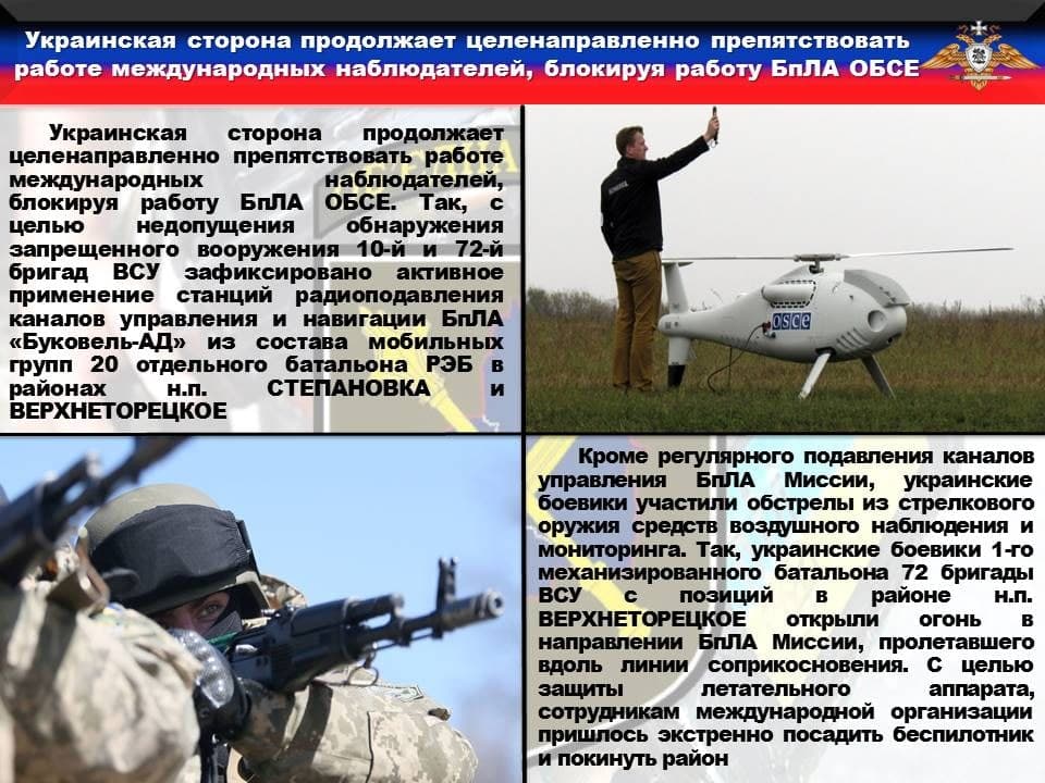 Украинская сторона продолжает целенаправленно препятствовать работе международных наблюдателей, блокируя работу БпЛА ОБСЕ. Так, с целью недопущения обнаружения запрещенного вооружения 10-й и 72-й бригад ВСУ зафиксировано активное применение станций радиоподавления каналов управления и навигации БпЛА «Буковель-АД» из состава мобильных групп 20 отдельного батальона РЭБ в районах н.п. СТЕПАНОВКА и ВЕРХНЕТОРЕЦКОЕ.