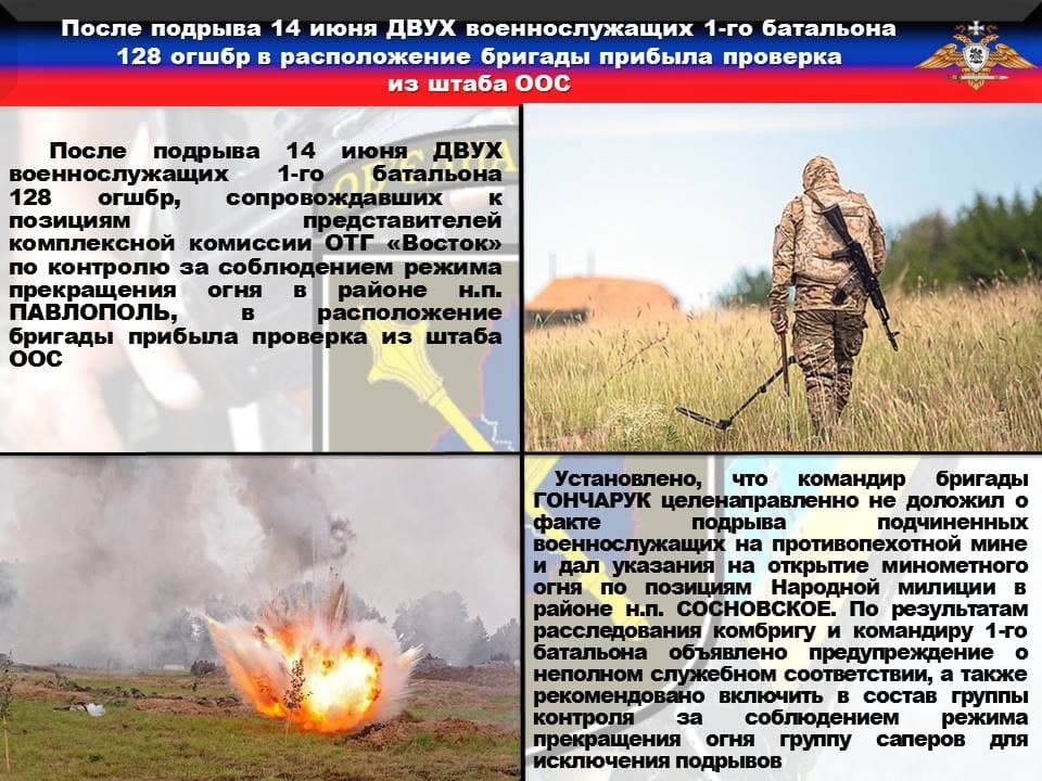 Установлено, что командир бригады ГОНЧАРУК целенаправленно не доложил о факте подрыва подчиненных военнослужащих на противопехотной мине и дал указания на открытие минометного огня по позициям Народной милиции в районе н.п. СОСНОВСКОЕ. По результатам расследования комбригу и командиру 1-го батальона объявлено предупреждение о неполном служебном соответствии, а также рекомендовано включить в состав группы контроля за соблюдением режима прекращения огня группу саперов для исключения подрывов.