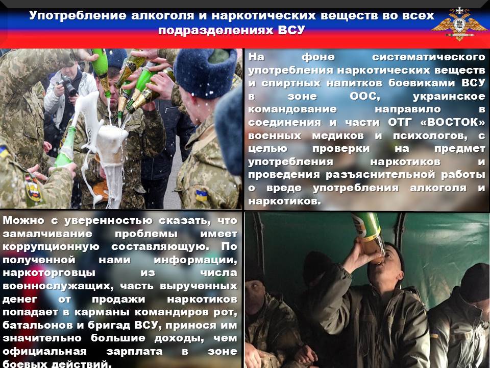 На фоне систематического употребления наркотических веществ и спиртных напитков боевиками ВСУ в зоне ООС, украинское командование направило в соединения и части ОТГ «ВОСТОК» военных медиков и психологов, с целью проверки на предмет употребления наркотиков и проведения разъяснительной работы о вреде употребления алкоголя и наркотиков.