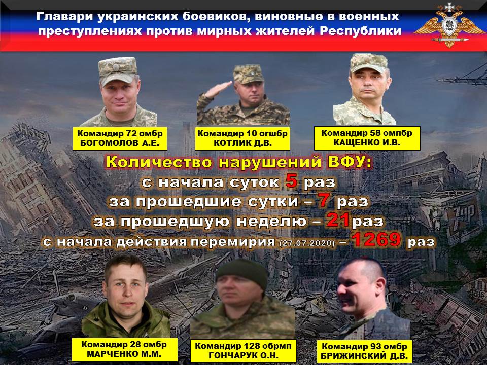 Всего за неделю зафиксировано ДВАДЦАТЬ ОДНО нарушение режима прекращения огня со стороны украинских вооруженных формирований. Противник вел огонь по населённым пунктам Республики, применяя артиллерию калибром 122 мм, минометы калибром 120 мм и 82 мм, различные типы гранатометов и стрелковое оружие.