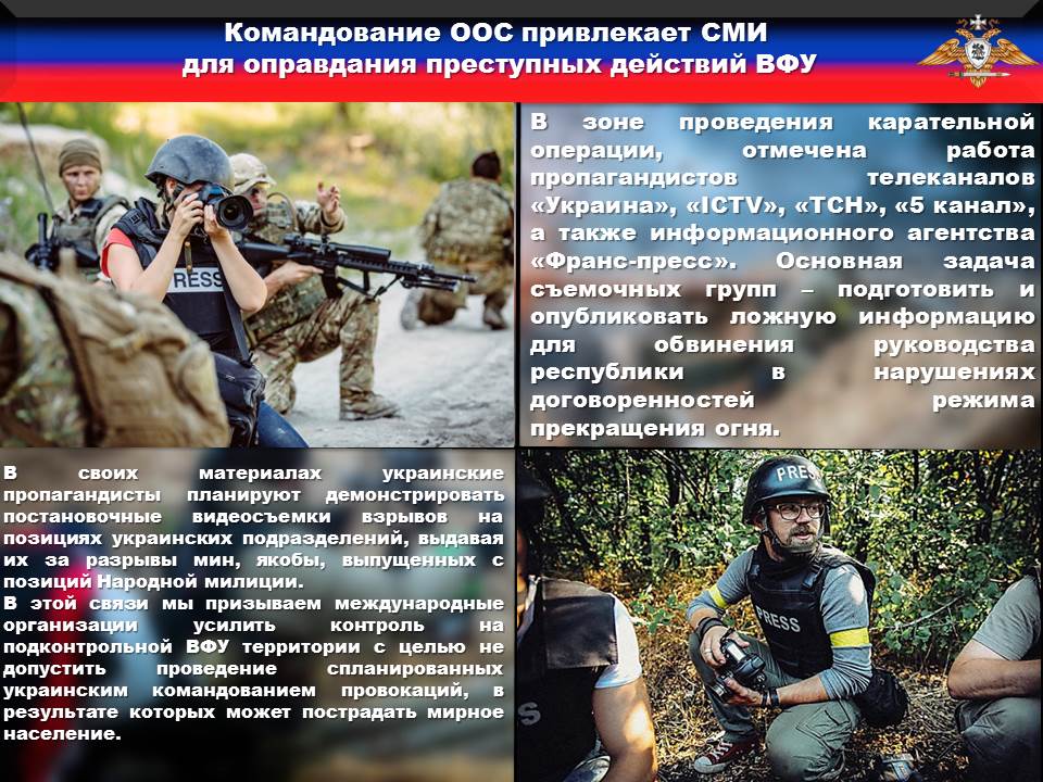 Так, по данным нашей разведки, в зоне проведения карательной операции, отмечена работа пропагандистов телеканалов «Украина», «ICTV», «ТСН», «5 канал», а также информационного агентства «Франс-пресс». Основная задача съемочных групп – подготовить и опубликовать ложную информацию для обвинения руководства республики в нарушениях договоренностей режима прекращения огня.