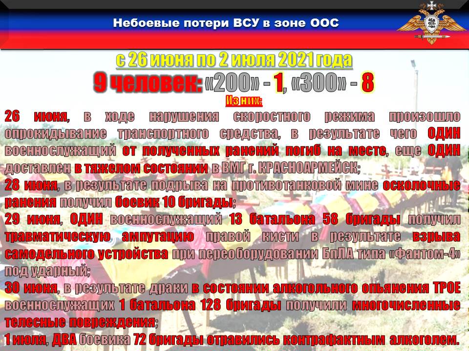 В период с 26 июня по 2 июля в соединениях и частях ОТГ «Восток» небоевые потери составили ДЕВЯТЬ военнослужащих: