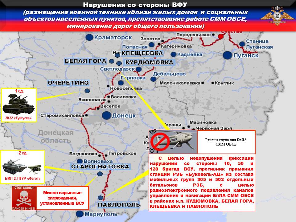 Украинская сторона продолжает целенаправленно препятствовать работе международных наблюдателей, блокируя работу БпЛА СММ ОБСЕ. Так, с целью недопущения фиксации нарушений со стороны 10, 59 и 128 бригад ВСУ, противник применил станции РЭБ «Буковель-АД» из состава мобильных групп 305 и 502 отдельных батальонов РЭБ, с целью радиоэлектронного подавления каналов управления и навигации БпЛА СММ ОБСЕ в районах н.п. КУДЮМОВКА, БЕЛАЯ ГОРА, КЛЕЩЕЕВКА и ПАВЛОПОЛЬ.
