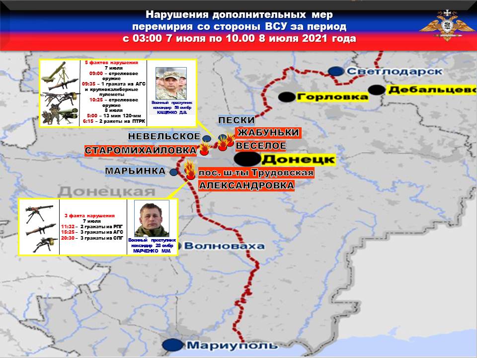 С позиций 3 механизированного батальона 28 омпбр ВСУ в районе н.п. МАРЬИНКА, по приказу военного преступника МАРЧЕНКО, трижды открывали огонь из СПГ, РПГ и АГС по окраинам поселка шахты «ТРУДОВСКАЯ» и н.п. АЛЕКСАНДРОВКА.