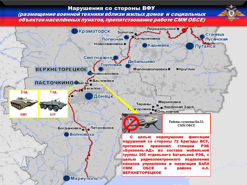 Украинская сторона продолжает блокировать работу БпЛА СММ ОБСЕ. Так, с целью недопущения фиксации нарушений со стороны 72 бригады ВСУ, противник применил станции РЭБ «Буковель-АД» из состава мобильной группы 305 отдельного батальона РЭБ, с целью радиоэлектронного подавления каналов управления и навигации БпЛА СММ ОБСЕ в районе н.п. ВЕРХНЕТОРЕЦКОЕ.
