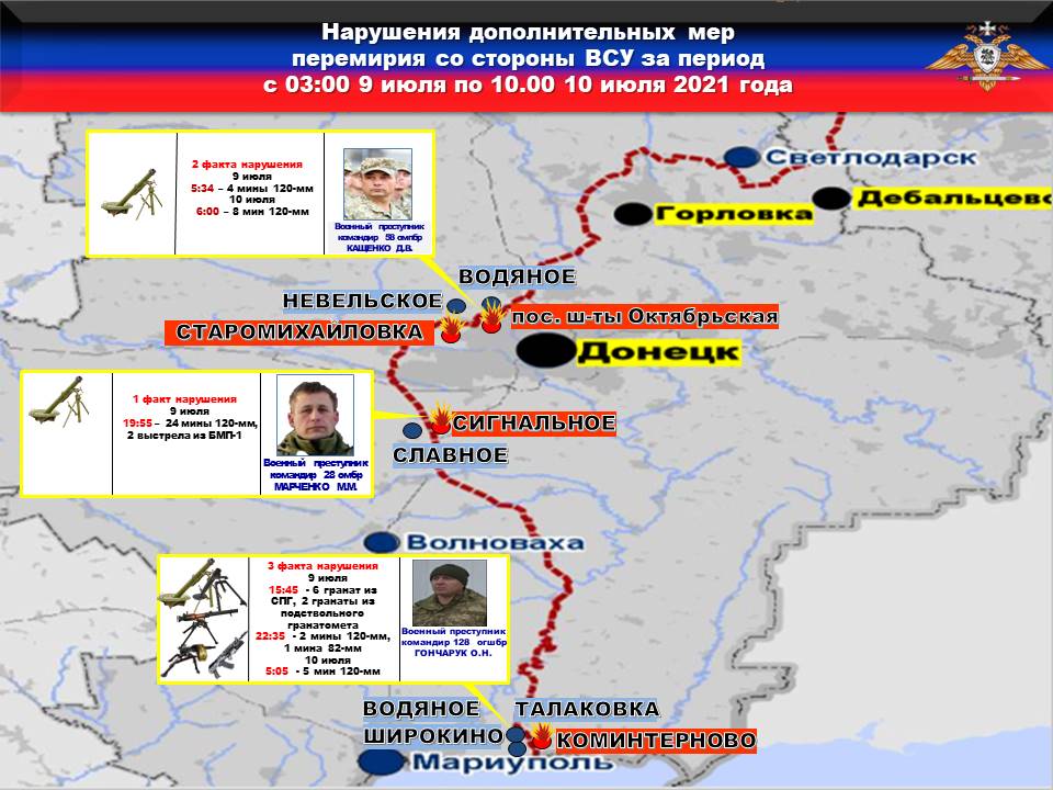 Факты нарушений в оперативном порядке доведены до представителей украинской стороны в СЦКК, с целью своевременного принятия мер к нарушителям и исключения случаев фальсификации учетных данных о нарушениях режима прекращения огня со стороны украинских боевиков.