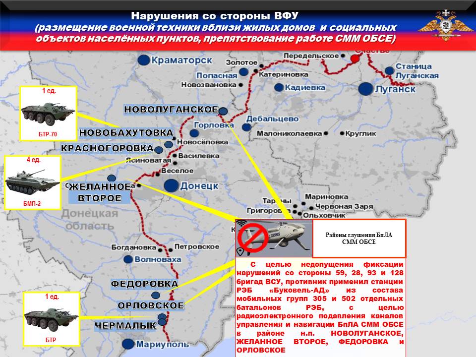 Украинская сторона продолжает блокировать работу БпЛА СММ ОБСЕ. Так, с целью недопущения фиксации нарушений со стороны 28, 93 и 128 бригад ВСУ, противник применил станции РЭБ «Буковель-АД» из состава мобильных групп 305 и 502 отдельных батальонов РЭБ, с целью радиоэлектронного подавления каналов управления и навигации БпЛА СММ ОБСЕ в районе н.п. ЖЕЛАННОЕ ВТОРОЕ, ФЕДОРОВКА и ОРЛОВСКОЕ.