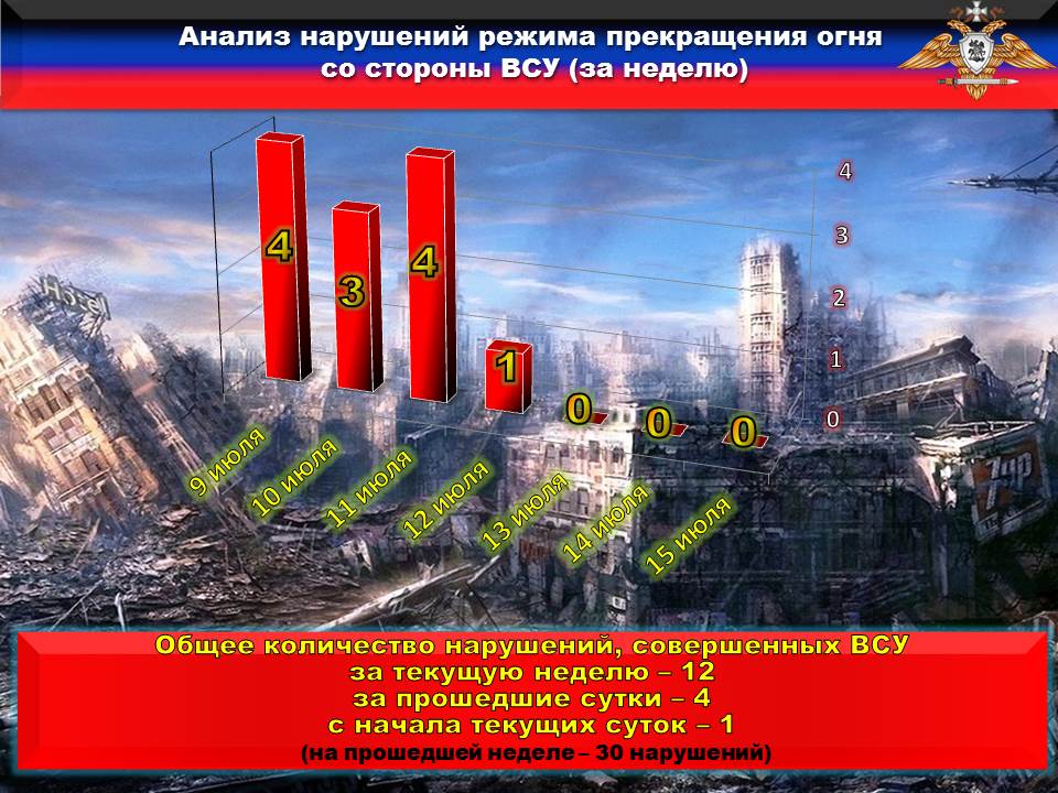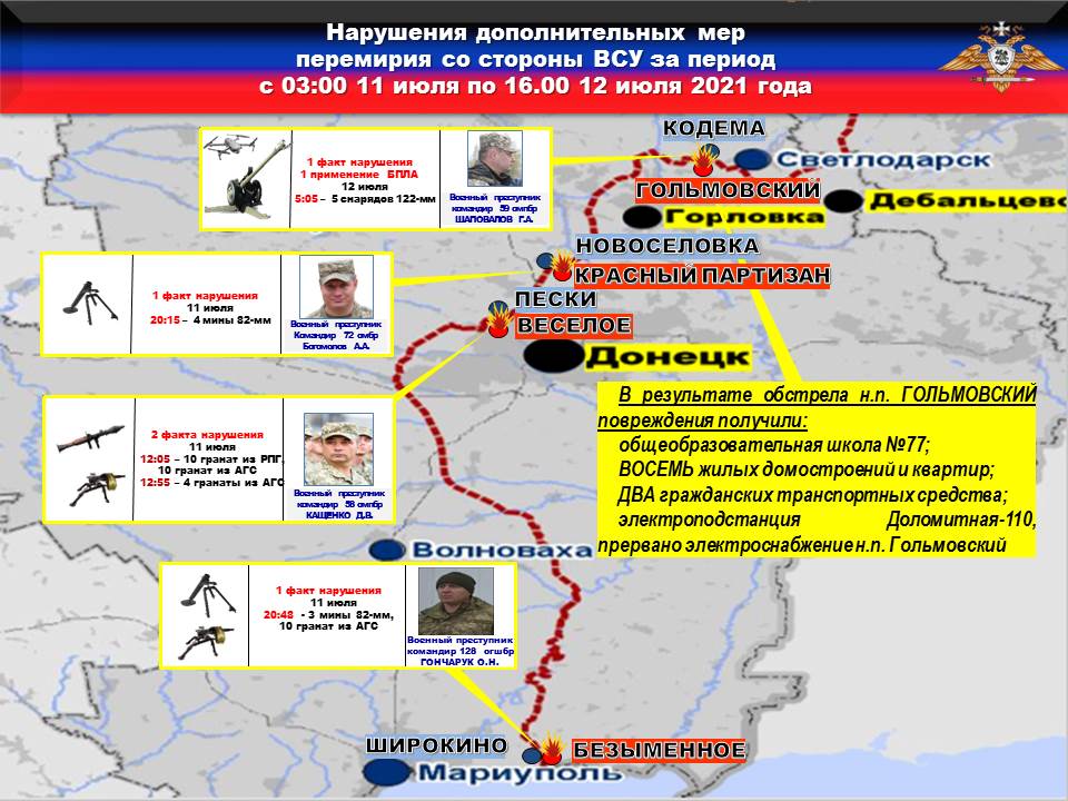 Факты нарушений в оперативном порядке доведены до представителей украинской стороны в СЦКК, с целью своевременного принятия мер к нарушителям перемирия и исключения фальсификации данных о нарушениях режима прекращения огня со стороны украинских боевиков.