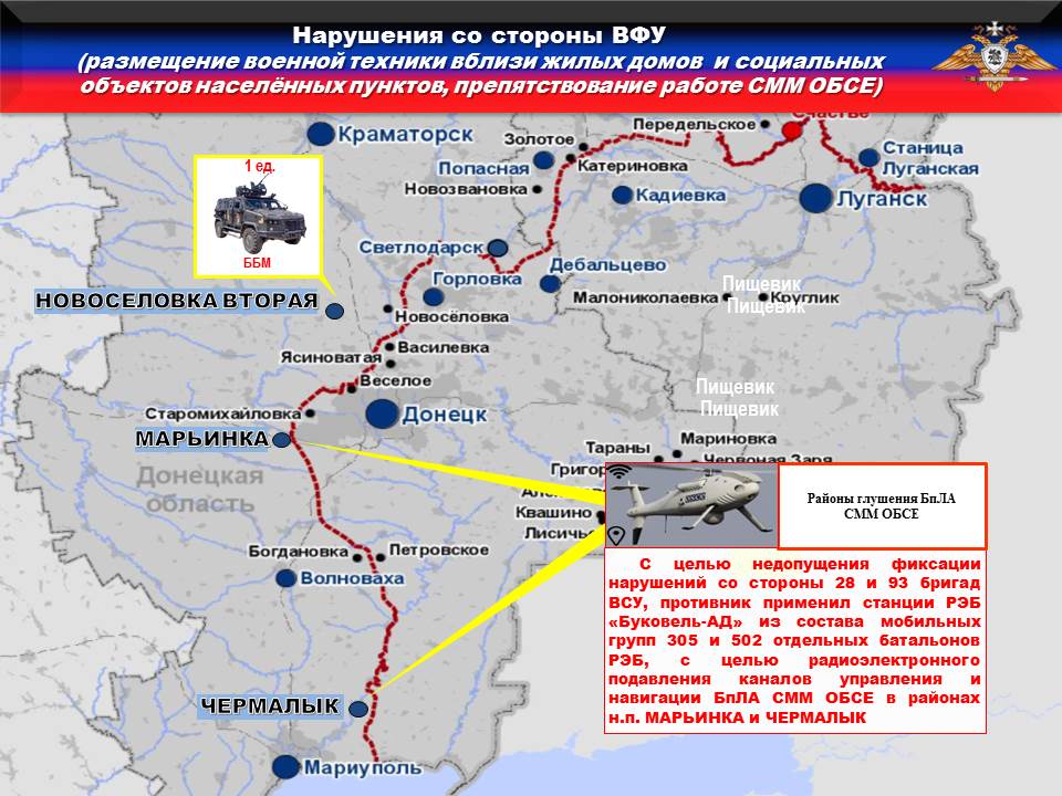 В тоже время украинская сторона продолжает блокировать работу БЛА СММ ОБСЕ чем нарушает мандат миссии. Так, с целью недопущения фиксации нарушений со стороны 28 и 93 бригад ВСУ, противник ДВАЖДЫ применил станции РЭБ «Буковель-АД» из состава мобильных групп 305 и 502 отдельных батальонов РЭБ, с целью радиоэлектронного подавления каналов управления и навигации БпЛА СММ ОБСЕ в районах н.п. МАРЬИНКА и ЧЕРМАЛЫК. В связи с чем, наблюдатели были вынуждены прекратить мониторинг и покинуть указанные районы.