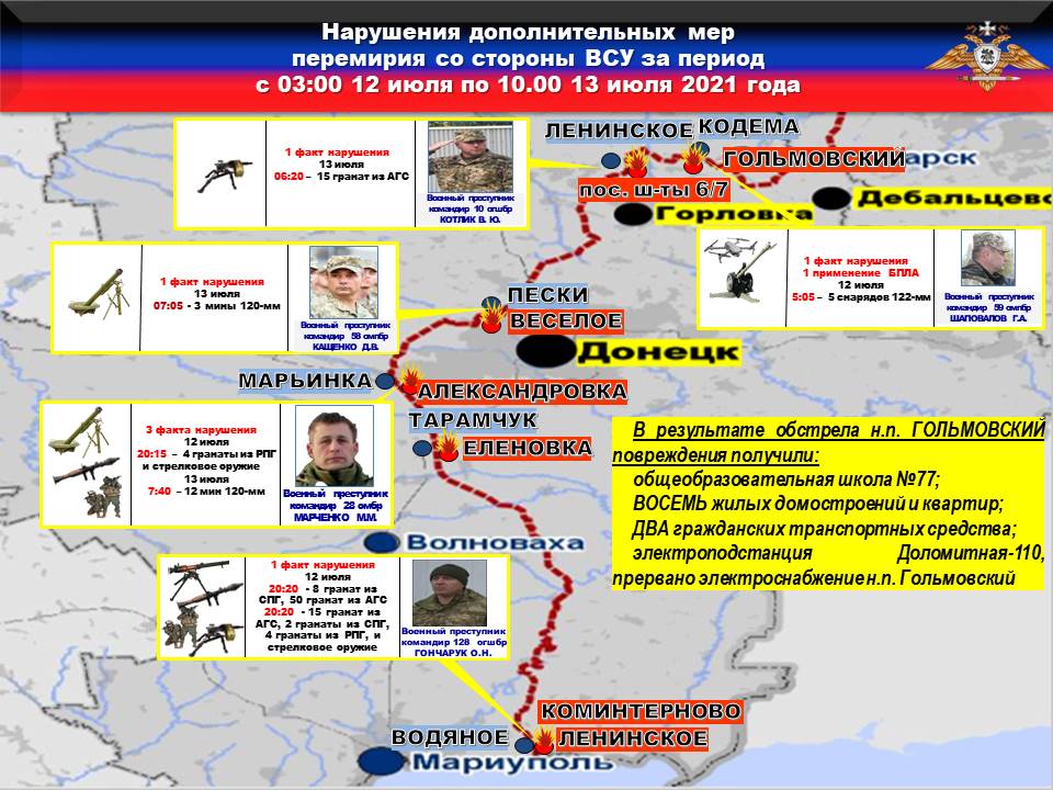 Факты нарушений в оперативном порядке доведены до представителей украинской стороны в СЦКК, с целью своевременного принятия мер к нарушителям перемирия и исключения фальсификации данных о нарушениях режима прекращения огня со стороны украинских боевиков.