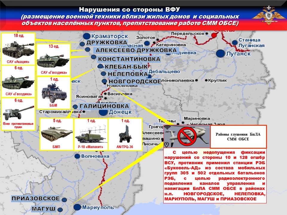 Украинская сторона продолжает блокировать работу БпЛА СММ ОБСЕ. Так, с целью недопущения фиксации нарушений со стороны 10 и 128 огшбр ВСУ, противник применил станции РЭБ «Буковель-АД» из состава мобильных групп 305 и 502 отдельных батальонов РЭБ, с целью радиоэлектронного подавления каналов управления и навигации БпЛА СММ ОБСЕ в районах н.п. НОВГОРОДСКОЕ, НЕЛЕПОВКА, МАРИУПОЛЬ, МАГУШ и ПРИАЗОВСКОЕ.