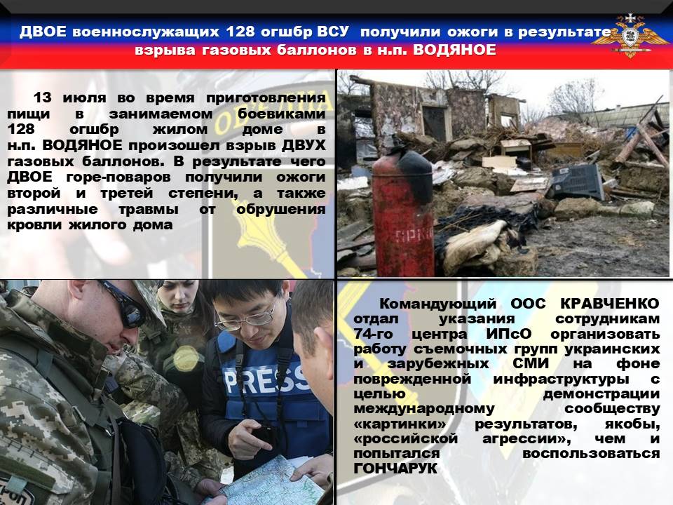 Нам стало известно об очередной попытке украинского командования переложить ответственность за разрушение частной собственности гражданского населения. Так, 13 июля во время приготовления пищи в занимаемом боевиками 128 бригады жилом доме в н.п. ВОДЯНОЕ произошел взрыв ДВУХ газовых баллонов. В результате чего ДВОЕ горе-поваров получили ожоги второй и третей степени, а также различные травмы от обрушения кровли жилого дома. Понимая тяжесть последствий за преступные действия подчиненных боевиков, комбриг ГОНЧАРУК по договоренности с представителями украинского СЦКК воспользовался традиционной версией, представив доклад в штаб ОТГ «ВОСТОК», как результат обстрела.