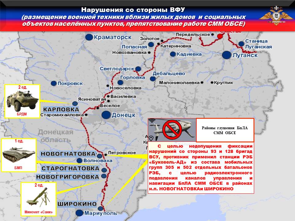 Украинская сторона продолжает блокировать работу БпЛА СММ ОБСЕ. Так, с целью недопущения фиксации нарушений со стороны 93 и 128 бригад ВСУ, противник применил станции РЭБ «Буковель-АД» из состава мобильных групп 305 и 502 отдельных батальонов РЭБ, с целью радиоэлектронного подавления каналов управления и навигации БпЛА СММ ОБСЕ в районах н.п. НОВОГНАТОВКА и ШИРОКИНО.