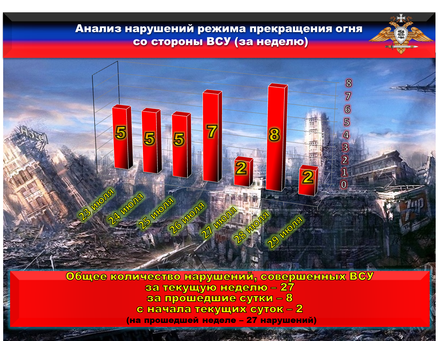 За прошедшие сутки со стороны украинских боевиков зафиксировано ВОСЕМЬ нарушений ВТОРОГО пункта Комплекса дополнительных мер по контролю за соблюдением режима прекращения огня.