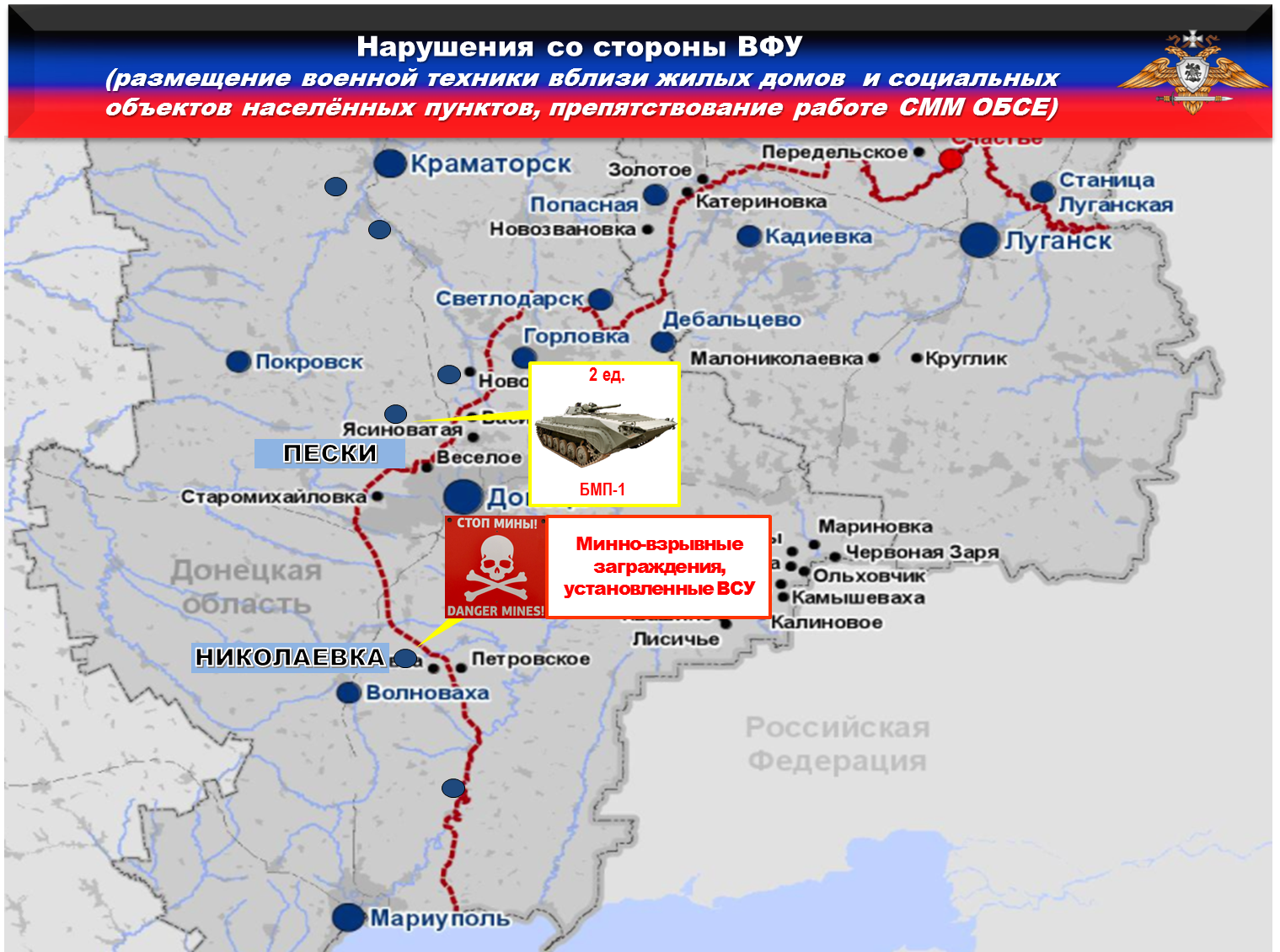 Украинские боевики продолжают минирование территорий, прилегающих к населенным пунктам и дорогам общего пользования, что напрямую угрожает жизни и здоровью мирных граждан и представителей Миссии ОБСЕ.