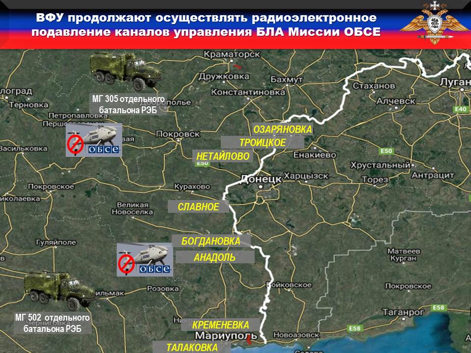 За неделю зафиксировано ПЯТНАДЦАТЬ фактов подавления каналов управления и навигации БпЛА наблюдателей СММ ОБСЕ вдоль всей линии боевого соприкосновения, в районах населенных пунктов: НЕТАЙЛОВО, БОГДАНОВКА, СЛАВНОЕ, АНАДОЛЬ, ТРОИЦКОЕ, ТАЛАКОВКА, КРЕМЕНЕВКА, ОЗАРЯНОВКА.