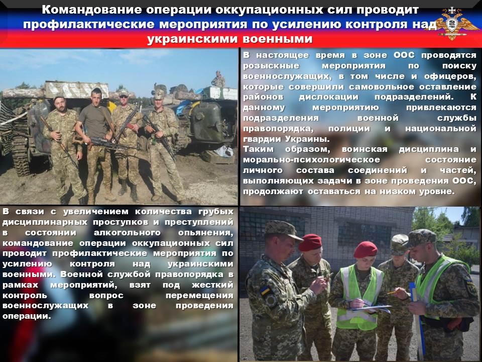 Кроме того, в связи с увеличением количества грубых дисциплинарных проступков и преступлений в состоянии алкогольного опьянения, командование операции оккупационных сил проводит профилактические мероприятия по усилению контроля над украинскими военными. Военной службой правопорядка в рамках мероприятий, взят под жесткий контроль вопрос перемещения военнослужащих в зоне проведения операции.
