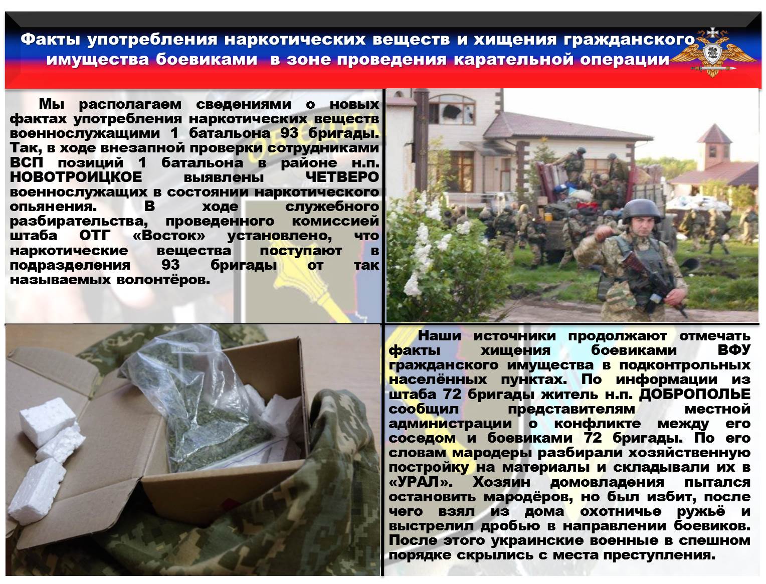 В ходе служебного разбирательства, проведенного комиссией штаба ОТГ «Восток» установлено, что наркотические вещества поступают в подразделения 93 бригады от так называемых волонтёров. Со слов военнослужащих схема доставки наркотических веществ действует уже давно и командир бригады Брижинский получает свою долю прибыли.