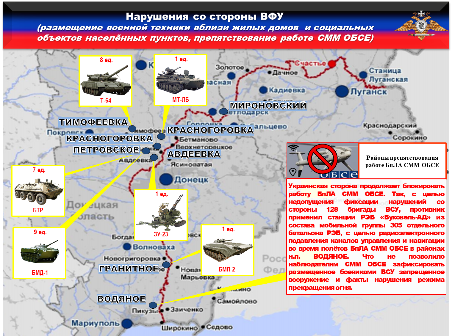 В нарушение ТРЕТЬЕГО пункта дополнительных мер, выявлено размещение ДВАДЦАТИ СЕМИ единиц вооружения и военной техники ВФУ вблизи жилых домов и муниципальных объектов на подконтрольной Украине территории: