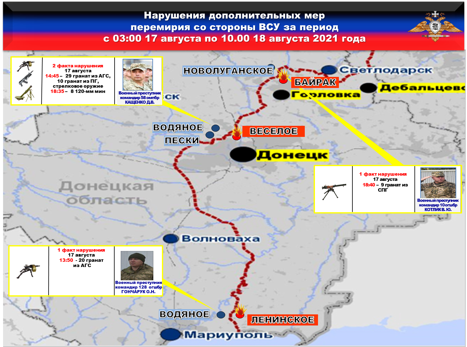 Факты нарушений в оперативном порядке доведены до представителей украинской стороны в СЦКК, с целью своевременного принятия мер к нарушителям перемирия и исключения фальсификации данных о нарушениях режима прекращения огня со стороны украинских боевиков.
