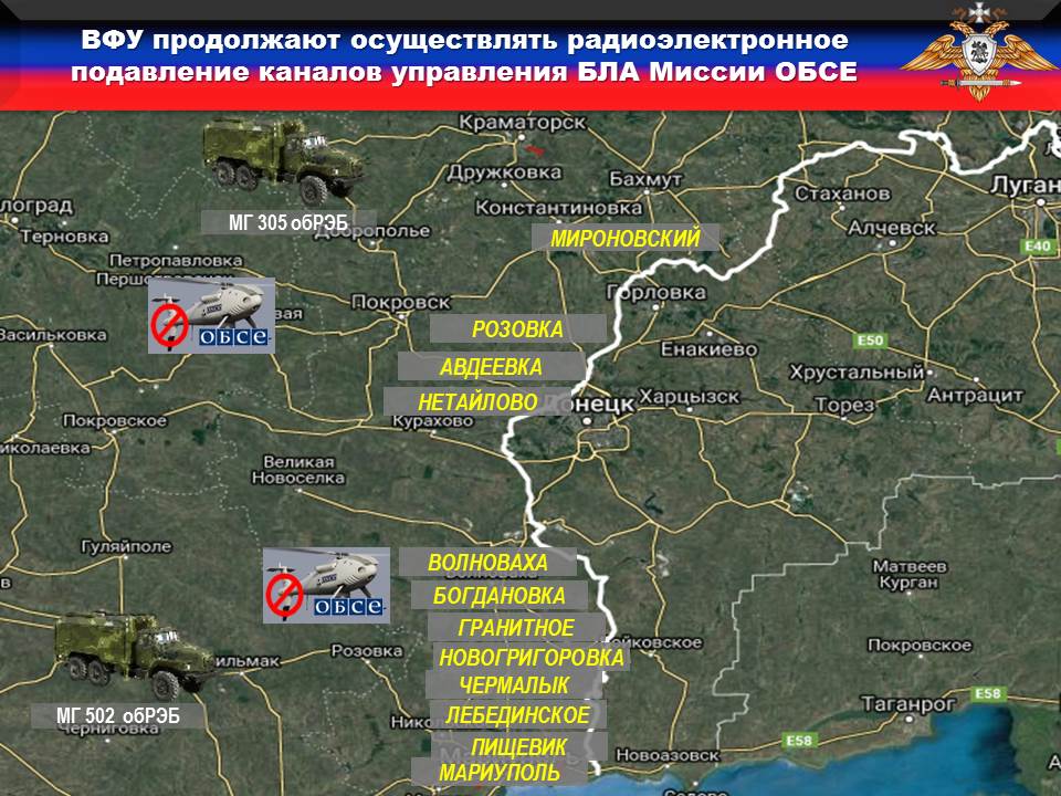 За неделю зафиксировано ДВЕНАДЦАТЬ фактов подавления каналов управления и навигации БпЛА наблюдателей СММ ОБСЕ вдоль линии боевого соприкосновения, в районах населенных пунктов: РОЗОВКА, БОГДАНОВКА, ВОЛНОВАХА, МАРИУПОЛЬ, МИРОНОВСКИЙ, НОВОГРИГОРОВКА, ГРАНИТНОЕ, ПИЩЕВИК, НЕТАЙЛОВО, ЛЕБЕДИНСКОЕ, АВДЕЕВКА и ЧЕРМАЛЫК.