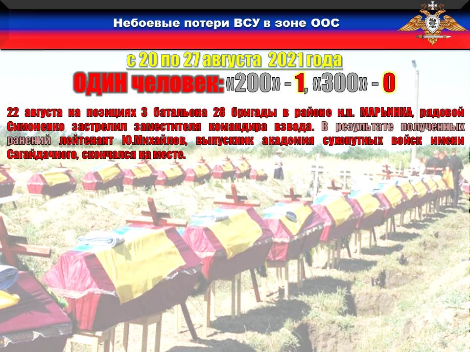 22 августа на позициях 3 батальона 28 бригады в районе н.п. МАРЬИНКА, рядовой Симоненко застрелил заместителя командира взвода. В результате полученных ранений лейтенант Ю.Михайлов выпускник академия сухопутных войск имени Сагайдачного, скончался на месте.