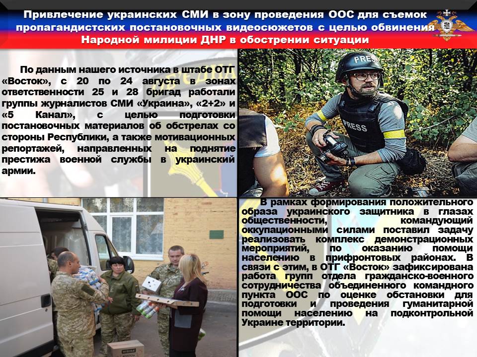 По данным нашего источника в штабе ОТГ «Восток», с 20 по 24 августа в зонах ответственности 25 и 28 бригад работали группы журналистов СМИ «Украина», «2+2» и «5 Канал», с целью подготовки постановочных материалов об обстрелах со стороны Республики, а также мотивационных репортажей, направленных на поднятие престижа военной службы в украинский армии.