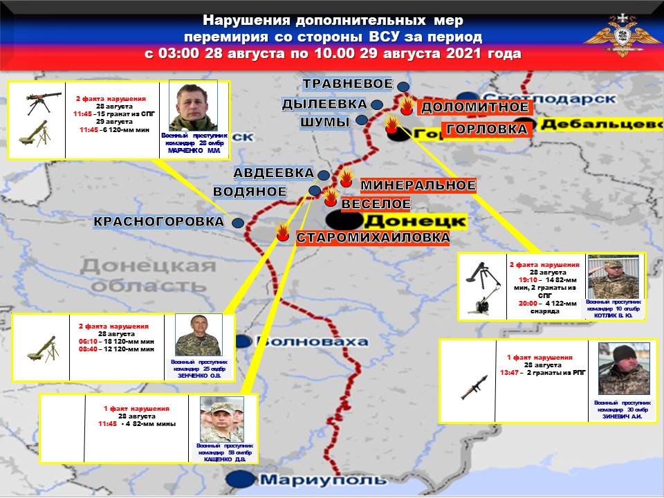 За прошедшие сутки со стороны украинских боевиков зафиксировано ВОСЕМЬ нарушений ВТОРОГО пункта Комплекса дополнительных мер по контролю за соблюдением режима прекращения огня.