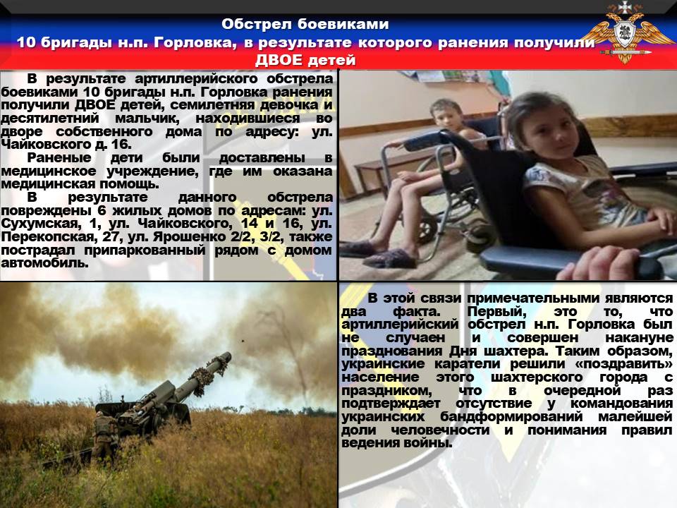 Хочу отдельно отметить артиллерийский обстрел боевиками 10 бригады н.п. Горловка, в результате которого ранения получили ДВОЕ детей, семилетняя девочка и десятилетний мальчик, находившиеся во дворе собственного дома по адресу: ул. Чайковского д. 16.
