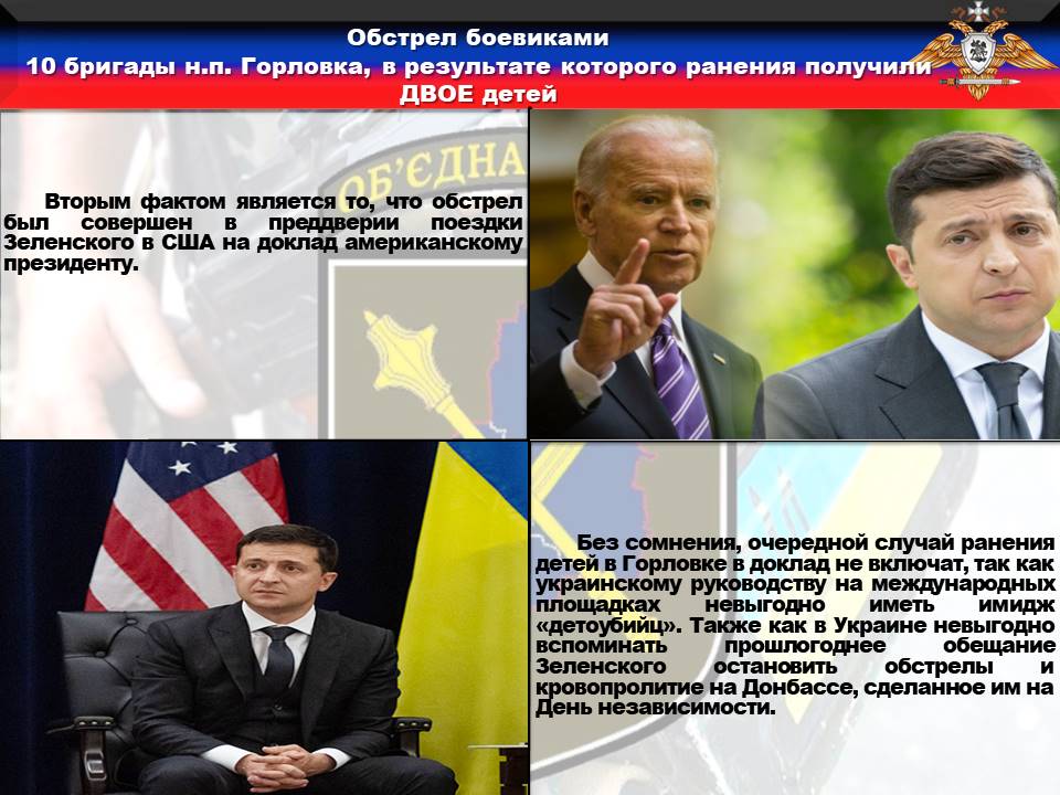 Вторым фактом является то, что обстрел был совершен в преддверии поездки Зеленского в США на доклад американскому президенту. Без сомнения, очередной случай ранения детей в Горловке в доклад не включат, так как украинскому руководству на международных площадках невыгодно иметь имидж «детоубийц». Также как в Украине невыгодно вспоминать прошлогоднее обещание Зеленского остановить обстрелы и кровопролитие на Донбассе, сделанное им на День независимости.
