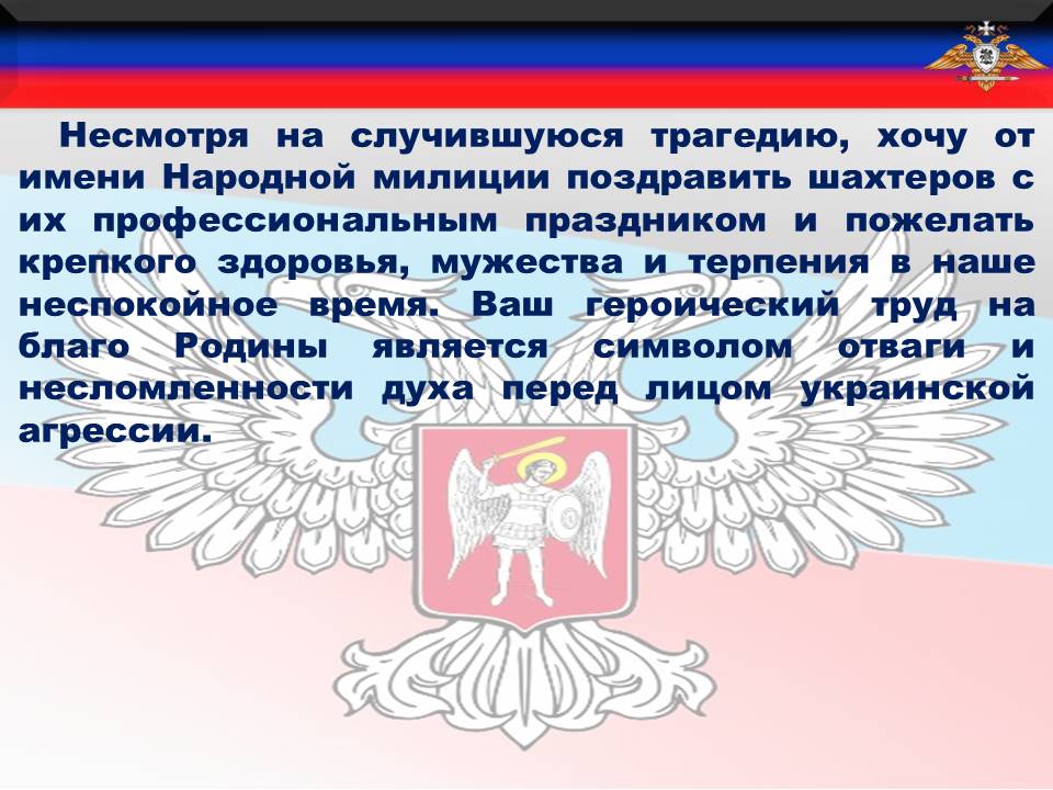 Однако, несмотря на случившуюся трагедию, хочу от имени Народной милиции поздравить шахтеров с их профессиональным праздником и пожелать крепкого здоровья, мужества и терпения в наше неспокойное время. Ваш героический труд на благо Родины является символом отваги и несломленности духа перед лицом украинской агрессии.