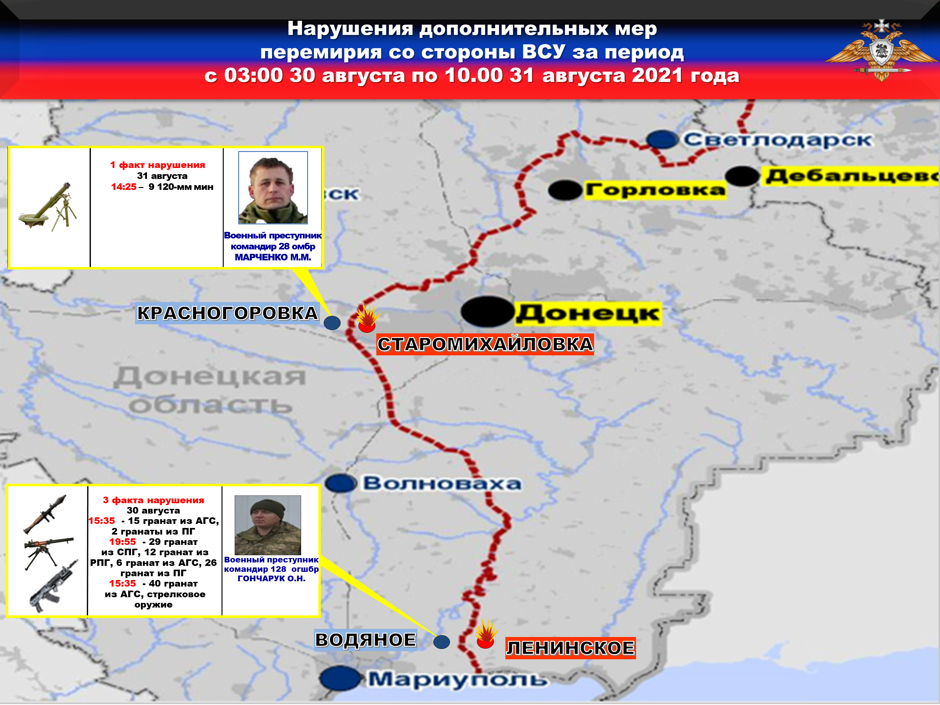 Боевики 28 бригады с позиций в н.п. КРАСНОГОРОВКА по приказу преступника МАРЧЕНКО произвели обстрел н.п. СТАРОМИХАЙЛОВКА, выпустив ДЕВЯТЬ мин калибром 120 мм.