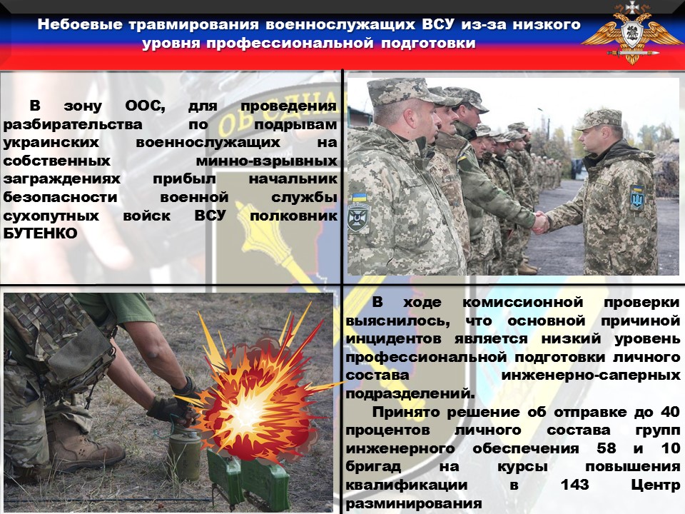 Как мы уже сообщали ранее, в целях разбирательства по подрывам украинских военнослужащих на собственных минно-взрывных заграждениях, в зону ООС прибыл начальник безопасности военной службы сухопутных войск ВСУ полковник БУТЕНКО. В ходе комиссионной проверки выяснилось, что основной причиной инцидентов является низкий уровень профессиональной подготовки личного состава инженерно-саперных подразделений. В целях минимизации небоевых потерь в дальнейшем, комиссией отданы указания об отправке до 40 процентов личного состава групп инженерного обеспечения 58 и 10 бригад на курсы повышения квалификации в 143 Центр разминирования.