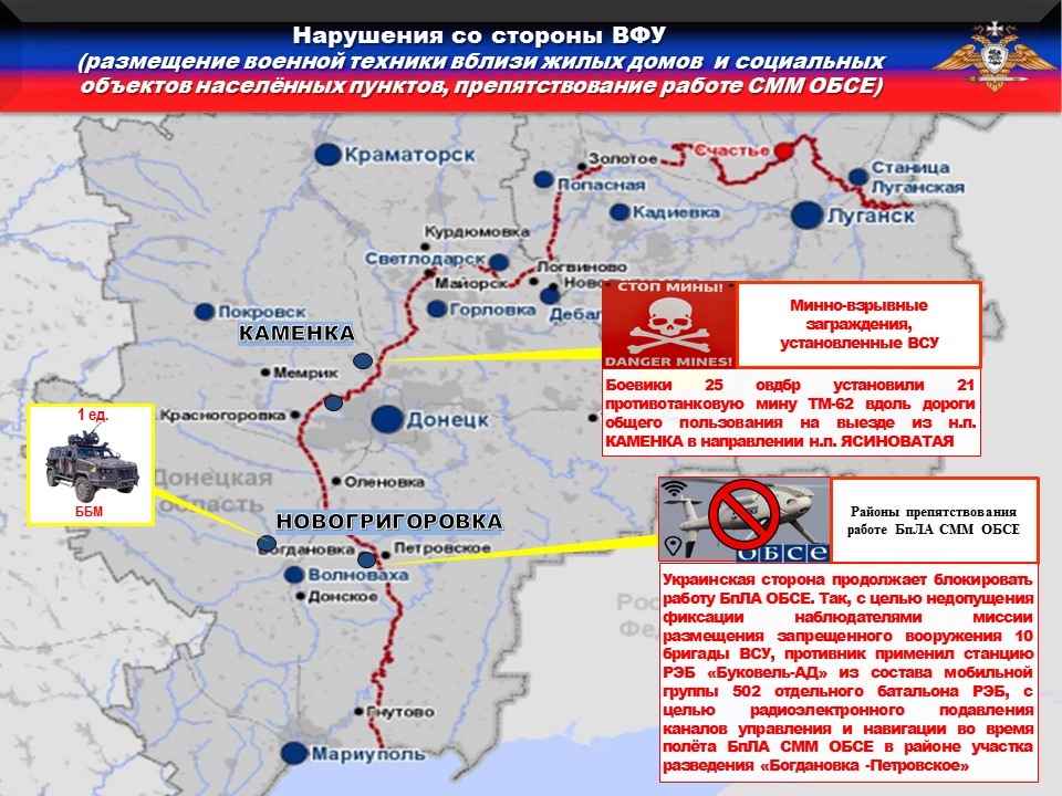 Украинское командование продолжает нарушать мандат СММ ОБСЕ. Так, с целью недопущения фиксации БПЛА Миссии нарушений со стороны 93 бригады ВСУ, противник применил станции РЭБ «Буковель-АД» из состава мобильных групп 305 отдельного батальона РЭБ, с целью радиоэлектронного подавления каналов управления и навигации во время полётов БпЛА СММ ОБСЕ в районе участка разведения «Богдановка -Петровское».
