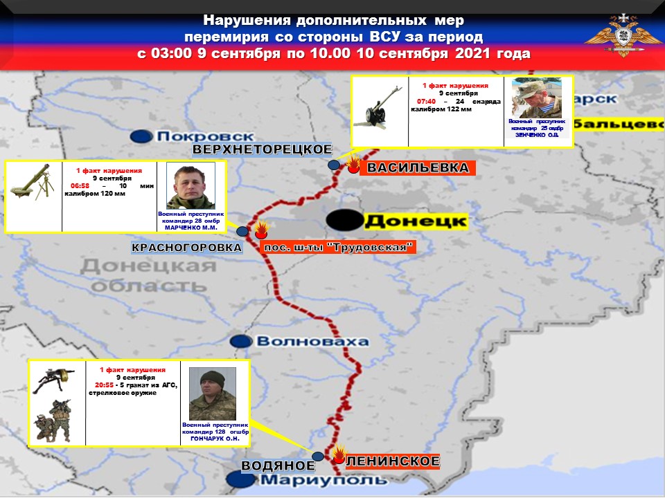 Международные наблюдатели продолжают фиксировать военные преступления ВСУ против мирного населения. Так, в отчете от 9 сентября 2021 года, наблюдатели подтвердили факт ранения мирного жителя г. Донецк, в результате обстрела 29 августа 2021 года с позиций 28 бригады.